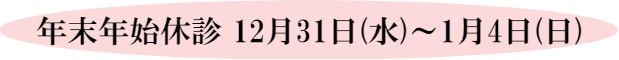年末年始の休診 日 月 火 水 木 金 土 12/28 29 30 31 1/1 2 3 休診 休診 休診 休診 休診 4 5 6 7 8 9 10 休診 午後休診 午後休診