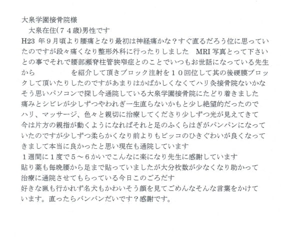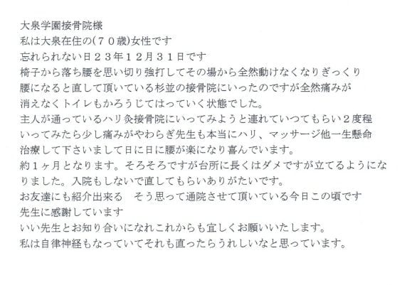 藁にもすがる思いで大泉学園鍼灸整骨院に電話相談しましたところ、院長先生から懇切丁寧に鍼治療についての解説をしていただき、その日のうちにお伺いして生まれて初めて鍼治療を受けた次第です。